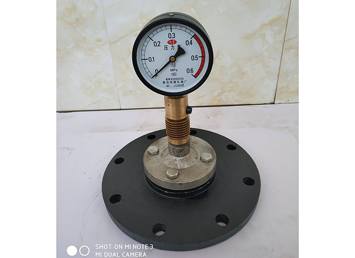 隔膜壓力表由各種通用型壓力儀表和不同結(jié)構(gòu)的隔膜隔離器組成一個(gè)封閉系統(tǒng),內(nèi)充密封液。當(dāng)被測(cè)介質(zhì)的壓力作用于隔膜時(shí),則隔膜產(chǎn)生變形,壓縮封閉系統(tǒng)中的密封液。由于密封液的固有性質(zhì),使壓力儀表中的彈性元件產(chǎn)生相應(yīng)的彈性變形——位移,經(jīng)指示裝置顯示壓力值。當(dāng)隔膜的剛度足夠小時(shí),則壓力儀表指示的壓力就近于被子測(cè)介質(zhì)的壓力值。