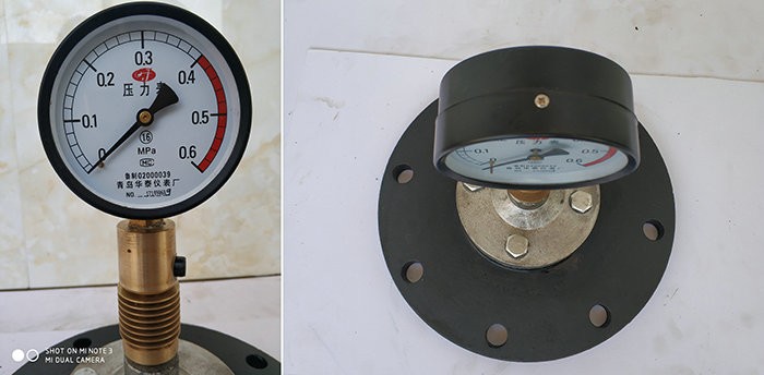 隔膜壓力表的耐蝕性可通過(guò)合適的選擇與測(cè)量介質(zhì)接觸部分的膜片,隔離器及密封墊圈的材料來(lái)保證。